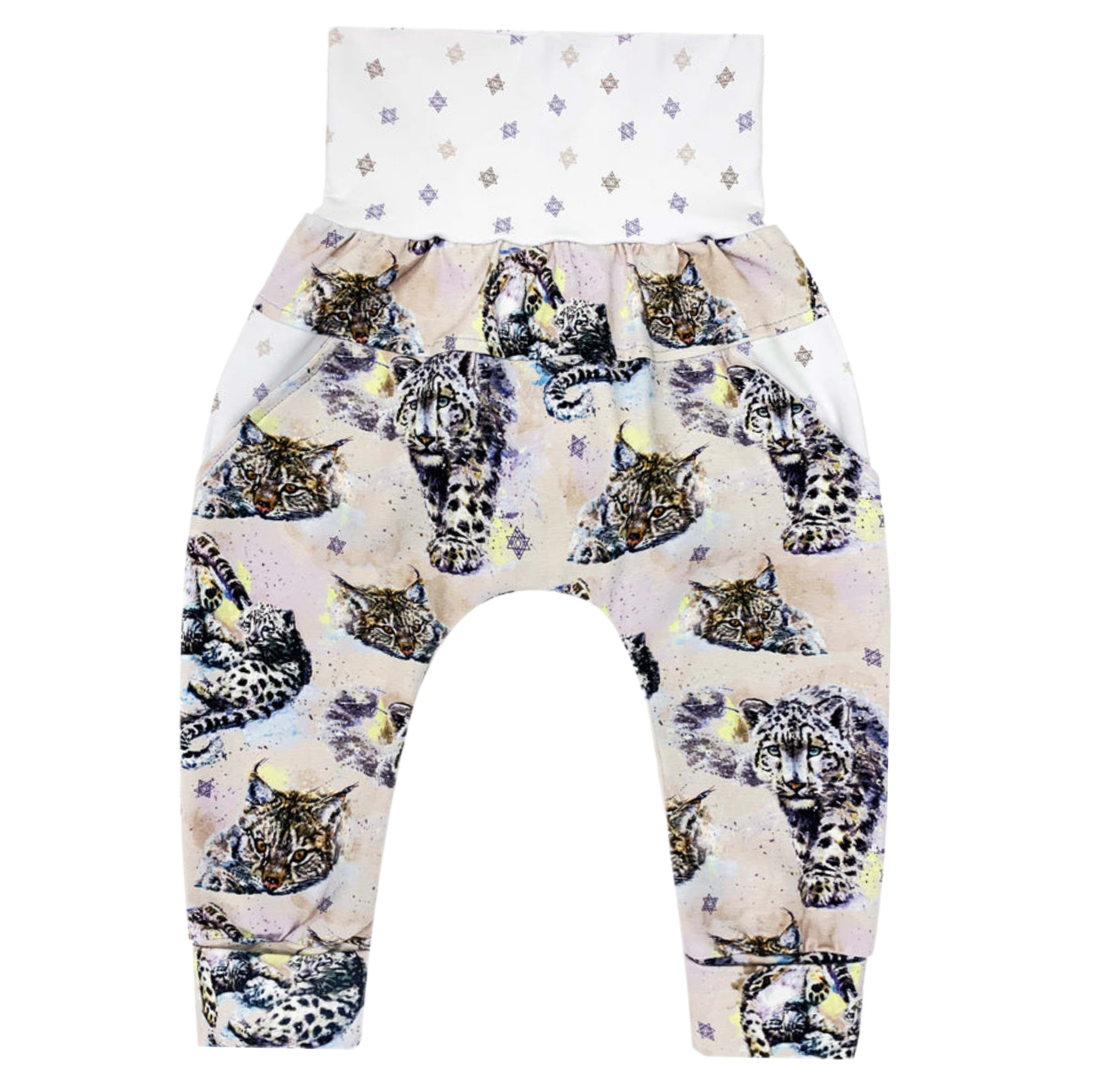 Pantalon évolutif beige, motif lynx, panthère des neige et taches peinture