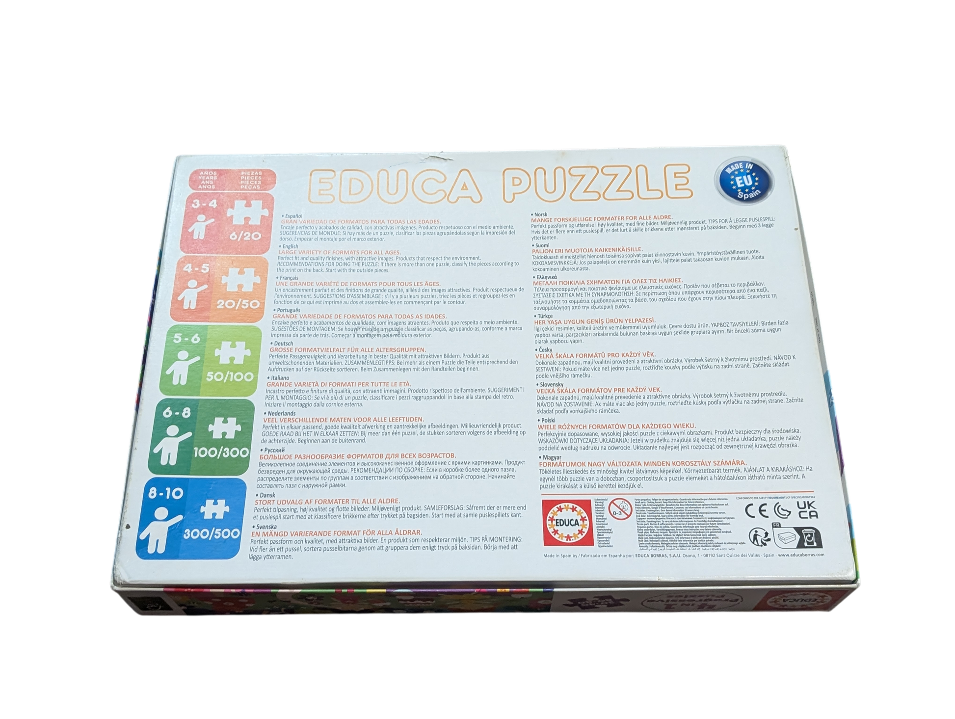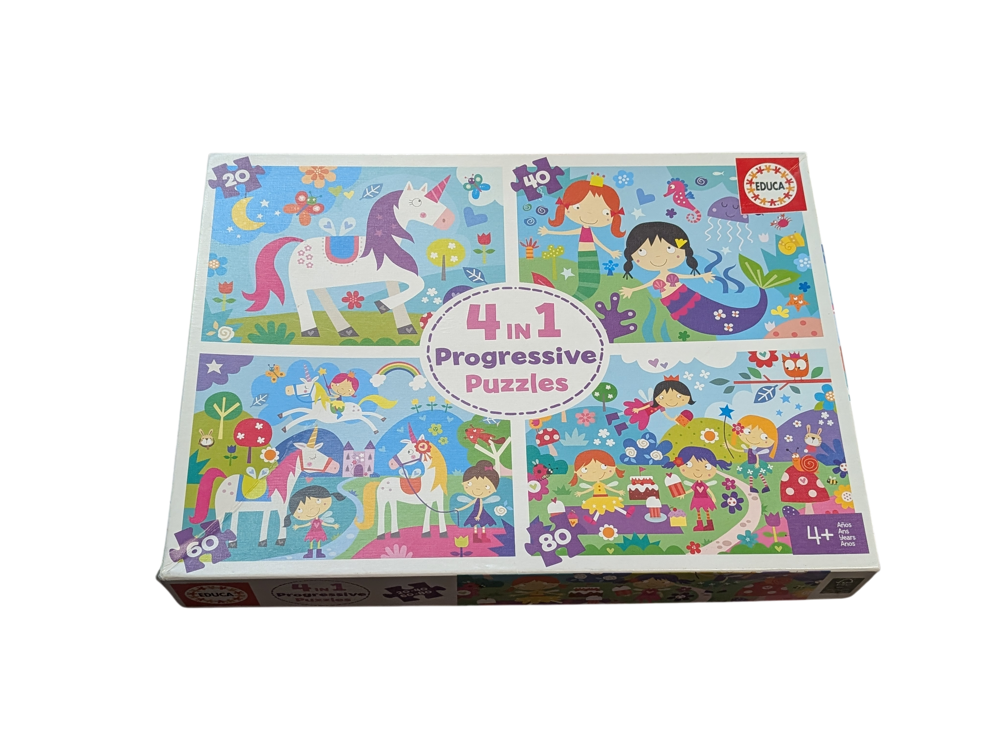 - La boîte contient quatre puzzles avec un nombre croissant de pièces : 20, 40, 60 et 80 pièces.