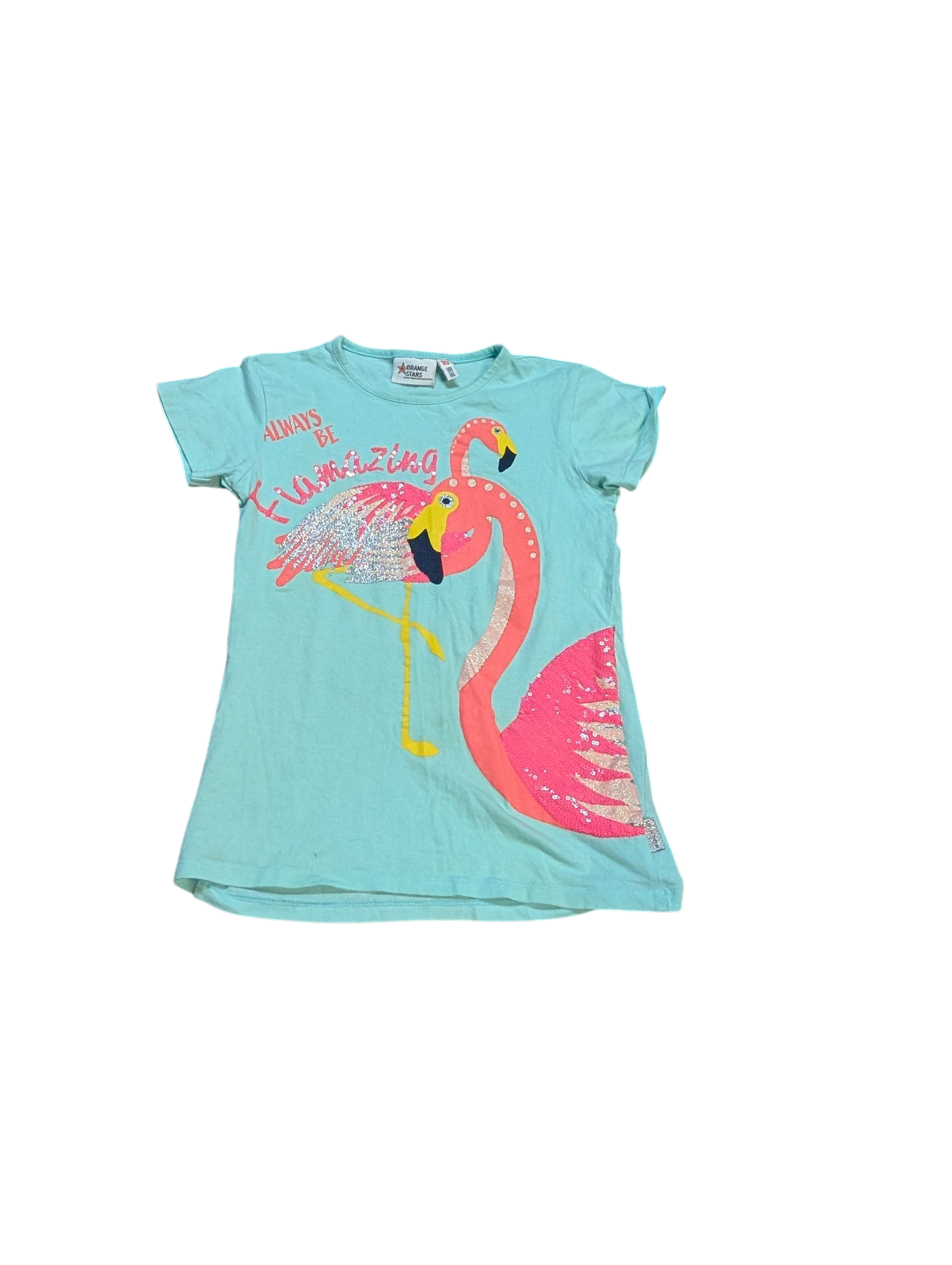 Chandail à manches courtes bleu avec flammants roses, en bon état.